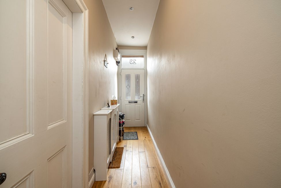 Access through front door leading into Hallway with wood flooring, radiator, doors to Living Room and Dining Room and stairs to upper floor accommodation.