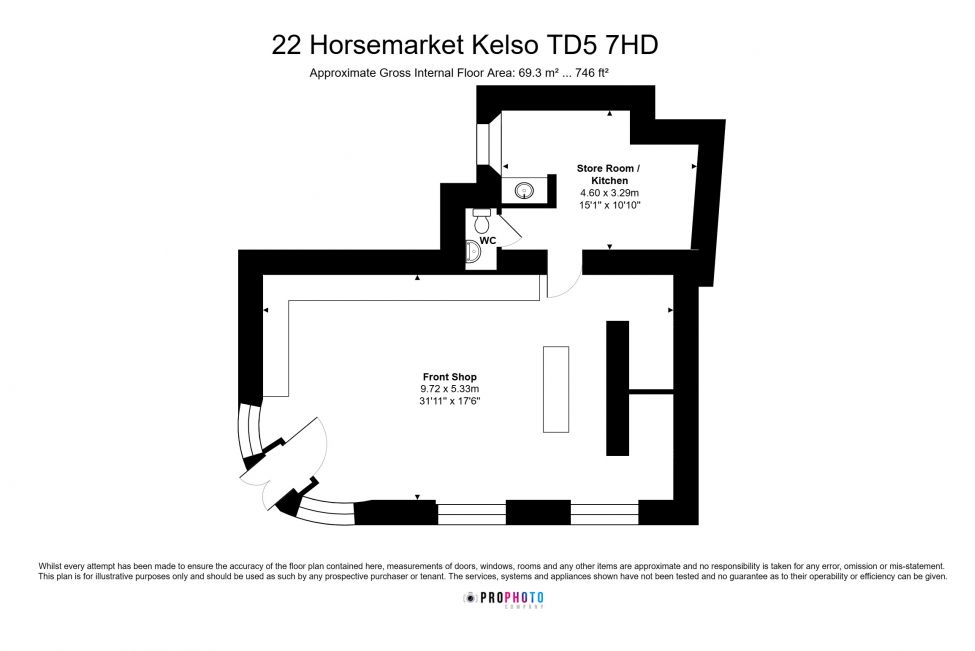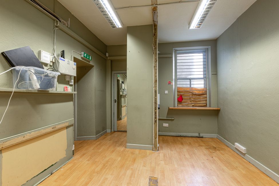 Extending to approximately 69 square metres, the accommodation is accessed via a corner entrance with two external steps leading to the main door. Internally, the unit comprises a bright, open-plan retail space, a changing area, a small store/kitchen, and a WC with a low flush unit and wash hand basin.