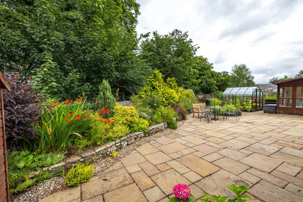Outside, the property is a gardener's dream. A paved driveway accommodates multiple vehicles, while meticulously maintained lawn and gravelled flower beds create a picturesque setting. The rear patio, enclosed by a traditional stone dyke, provides a private outdoor retreat complete with a charming summer house, shed, and greenhouse.
