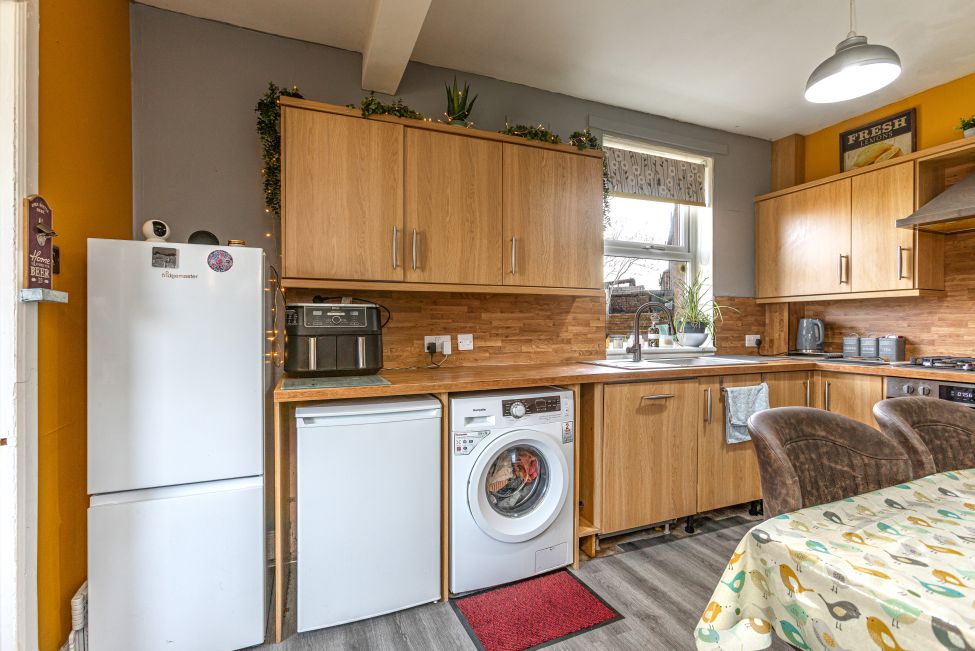 Wood fronted wall and floor units with wooden style splash back between units. Ample work surface area. Plumbed for washing machine. Space for fridge/freezer. Central heating radiator. PVC double-glazed window with display sill and roller blind. Stainless steel sink with single drainer. Double oven and gas hob. Integrated dishwasher. Stainless steel chimney style extractor fan. Doorway through to Back Porch/Utility.