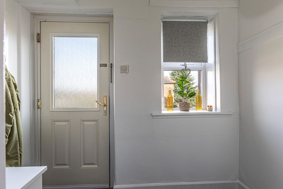 PVC double-glazed window with display sill and roller blind. Door to large under stairs storage cupboard. PVC door leading to garden.
