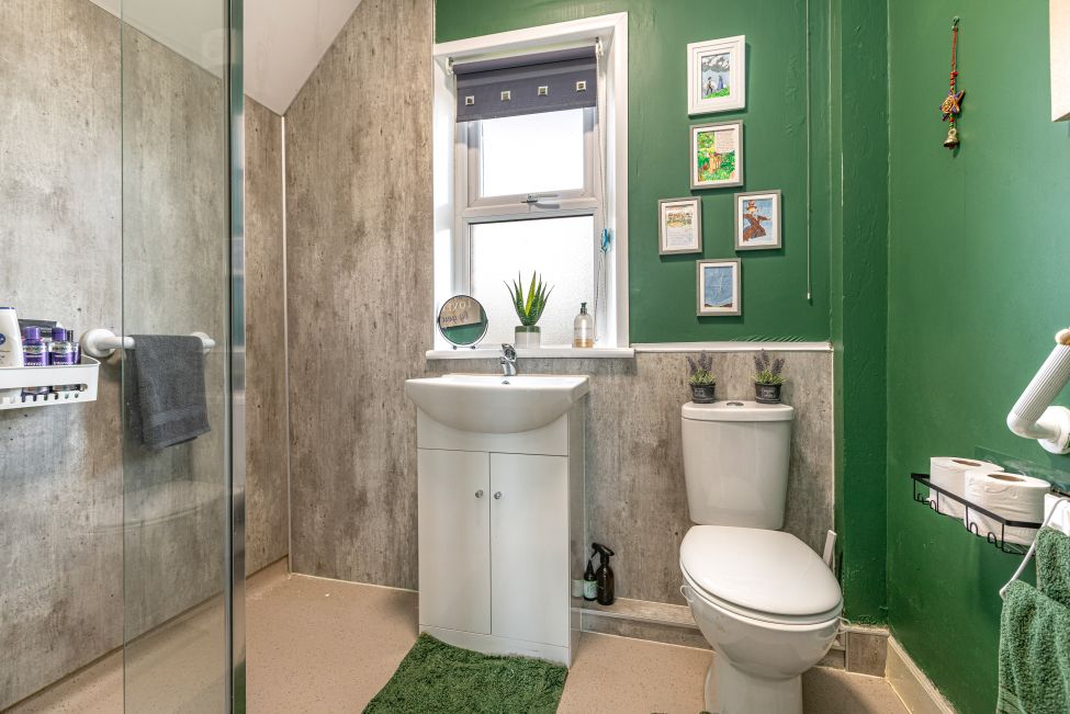 Wet room shower enclosure with glass screen. Respetex tiled walls. WC and wash hand basin in vanity unit. Central heating radiator. PVC patterned double-glazed window with display sill and roller blind.