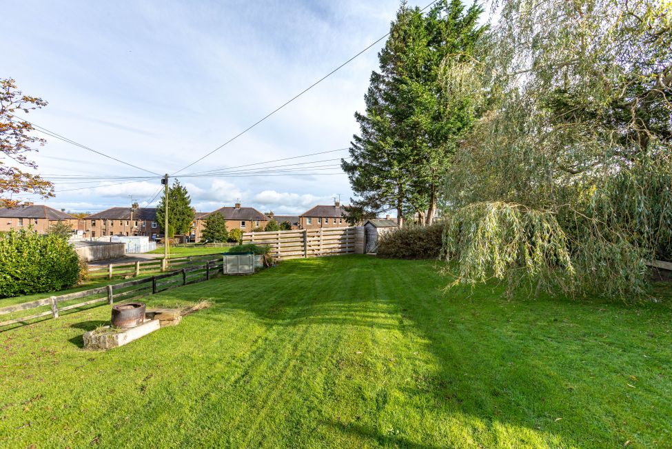 Front garden in grass with hedged boundaries. Pathway to front door. Grass area to side and fenced grass area to rear with fenced boundaries.