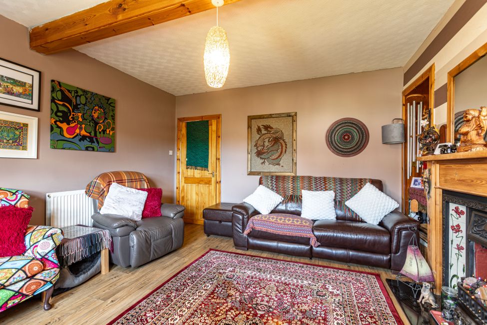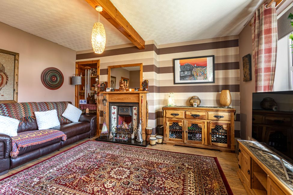 Attractive feature decrative and oramental fireplace with solid wooden mantel. PVC double-glazed window with display sill. Central heating radiator. Wall recess with shelving and cupboards. Door into Kitchen/diner.